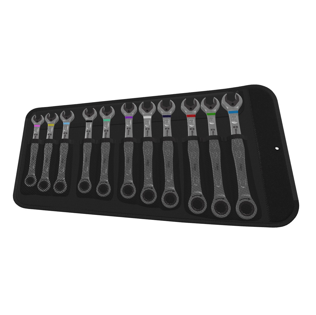 Hochwertiger Ringratschen-Maulschlüssel-Satz von Wera: Alles, was ein Schlüssel können muss. Und noch viel mehr. Schneller, besser, schöner. Eben ein echter Joker. Die neue Generation der Maul-Ringratschen-Schlüssel. 4-teiliger Satz in robuster Tasche. Für Sechskant-Schraubenköpfe bzw. -Muttern. Mit Haltefunktion durch Metallplatte im Maul, die die Gefahr des Verlierens von Schrauben und Muttern reduziert. Die auswechselbare Metallplatte im Maul sichert mit extra harten Zähnen Schrauben und Muttern und reduziert die Abrutschgefahr. Der integrierte Endanschlag kann das Abrutschen vom Schraubenkopf nach unten verhindern und ermöglicht das Aufbringen hoher Drehmomente. Die Doppelsechskantgeometrie sorgt für die formschlüssige Verbindung mit Schraube oder Mutter und damit für die Verringerung der Abrutschgefahr. Ein Rückschwenkwinkel von nur 30° auf der Maulseite vermeidet zeitintensives Wenden des Schlüssels beim Schrauben. Ratschenmechanik auf der Ringseite mit außergewöhnlich hoher Feinverzahnung von 80 Zähnen für Flexibilität auch in engen Bauräumen. Die spezielle Schmiedegeometrie sorgt für hohe Drehmomentübertragung und hohe Biegungssteifigkeit. Gefertigt aus leistungsfähigem Chrom-Molybdän-Stahl mit Nickel-Chrom Beschichtung für hohen Korrosionsschutz. Mit Werkzeugfinder "Take it easy": Farbkennzeichnung nach Größen.