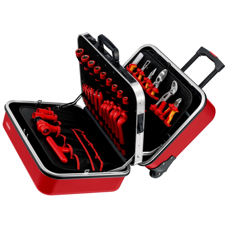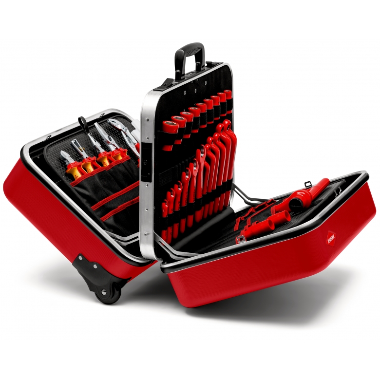 - Strapazierfähige Ausführung aus ABS-Material, rot; ausgestattet mit einem Sortiment KNIPEX-Werkzeuge für Arbeiten an elektrischen Anlagen, geprüft nach DIN EN/IEC 60900