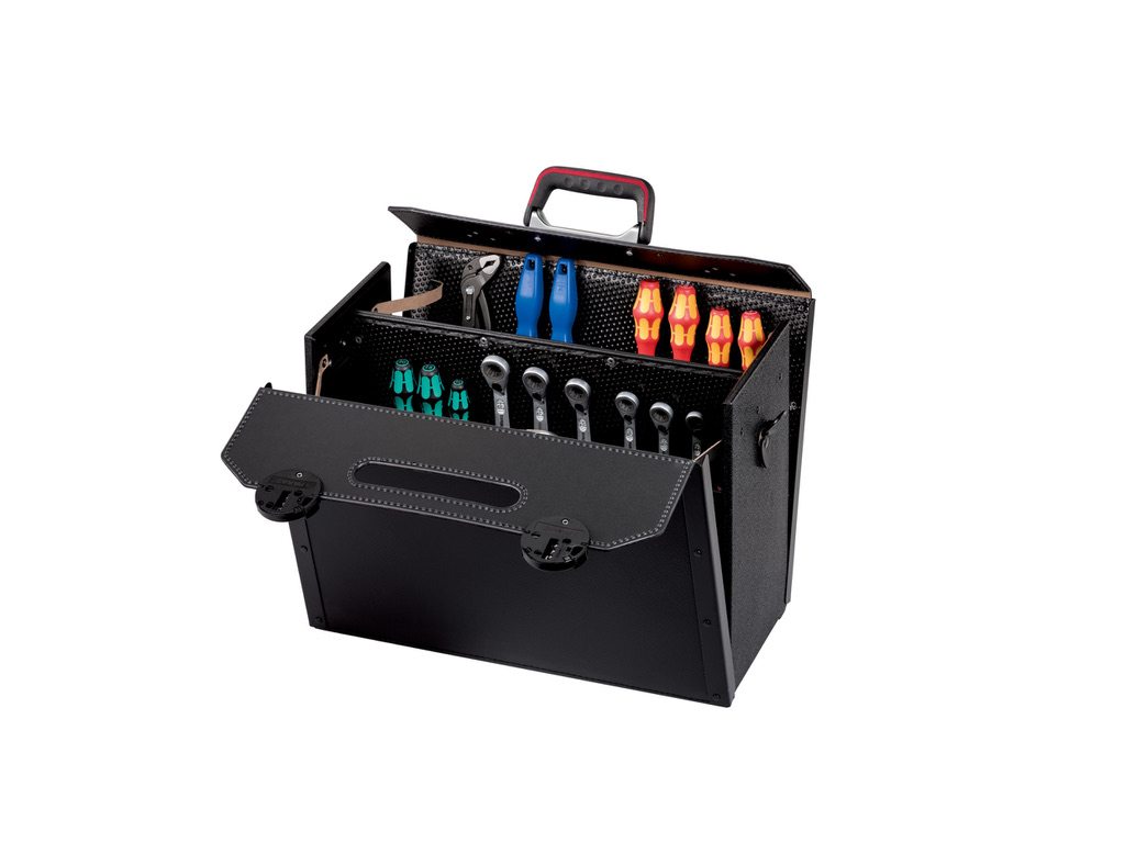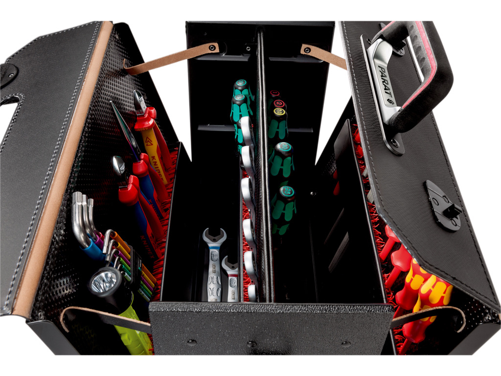 In diesem hochwertigen Stauraumwunder KingSize CP-7 aus der TOP-LINE Serie von PARAT lassen sich über 70 Werkzeuge unterbringen. Die Premium-Tasche aus schwarzem Rindsleder ist an den Seitenwänden mit Aluminiumwinkeln verstärkt, die für ein Plus an Stabilität sorgen und somit idealen Schutz vor Stößen und Schlägen bieten. Trotz dieser robusten Festigkeit bleibt die Tasche jedoch höchst flexibel zu handhaben: Für optimale Sicht auf die verstauten Werkzeuge sind die Vorder- und Rückwand aufklappbar. An diesen Wänden befindet sich jeweils eine CP-7-Halterung für mehrere Werkzeuge mit verschiedenen Durchmessern. Durch die speziell entwickelte Klemmwirkung aus hochwertigen Kunststoffen, bleibt alles stets an seinem Platz. Zwei weitere CP-7-Halterungen befinden sich an der fest integrierten Mittelwand. Die zweiteilige Abdeckung der KingSize CP-7 bietet sowohl ein Griffloch, als auch den ergonomisch geformten PARAT Tragegriff und wird mit Rastenschlössern gesichert. An den seitlich eingenieteten Ringkappen kann für zusätzlichen Komfort ein verstellbarer Tragegurt eingehängt werden. Dadurch ist die hochwertige Tasche von PARAT noch einfacher zu transportieren – so lassen sich 70 Werkzeuge bequem stemmen!