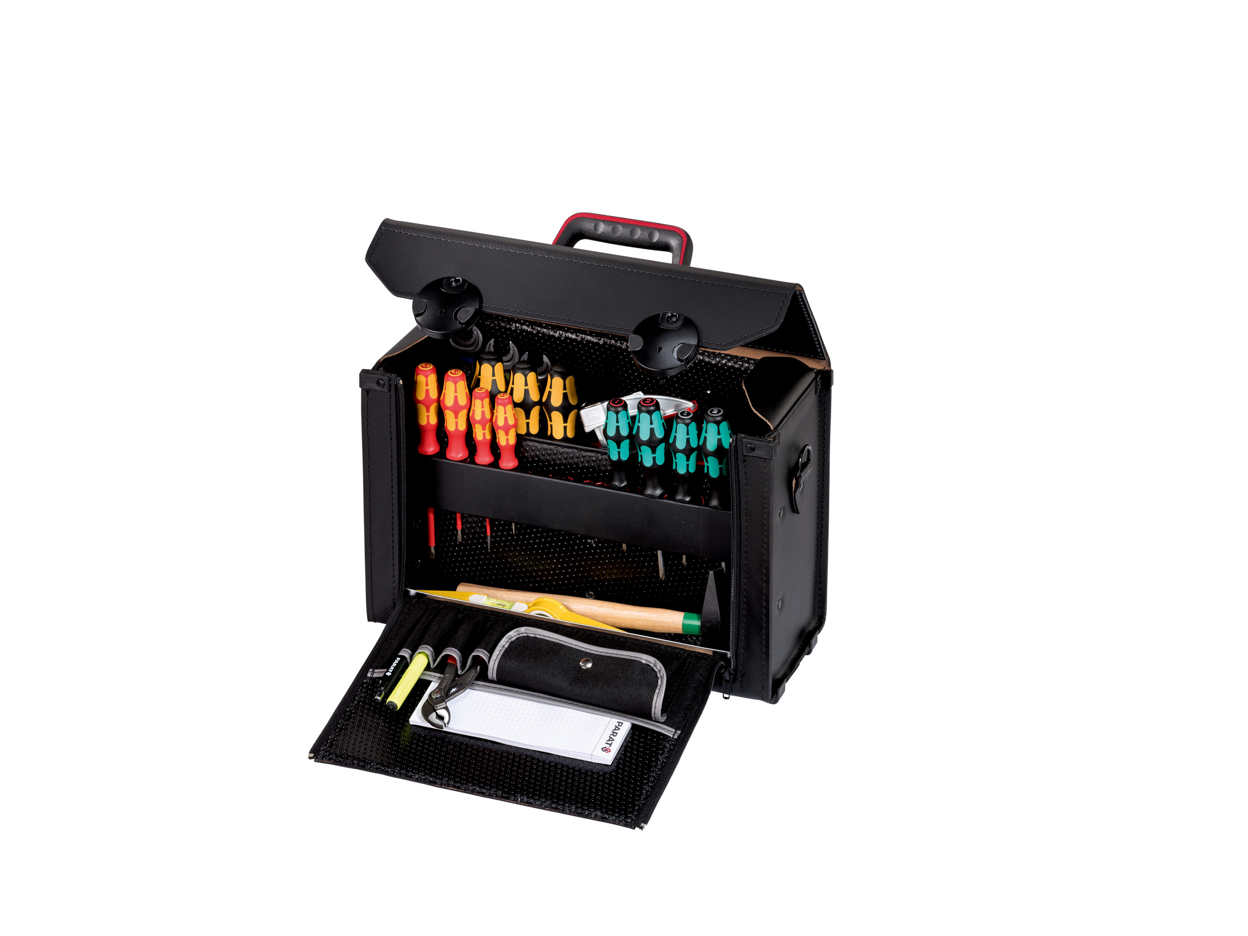 Die TOP-LINE Allround CP-7 von PARAT ist aus hochwertigem Rindsleder in Verbindung mit dem extrem strapazierfähigen Material Con-Pearl® gefertigt. Die Besonderheit dieser Premium-Tasche besteht in einer Mittelwand mit zwei verschiedenen CP-7 Werkzeughaltern: Dieses System ermöglicht es, unterschiedliche Werkzeuge an jeder beliebigen Stelle flexibel einzustecken und wieder zu entnehmen. Durch die rutschfeste Unterlage der festen Klemmwand sind alle Materialien sicher platziert. Für maximalen Nutzen des Stauraums ist auch an der Rückwand der Werkzeugtasche eine CP-7-Halterung angebracht. Darüber hinaus besitzt dieses Modell eine aufklappbare Vorderwand mit vier separaten Fächern. Ein Klemmfach bietet Platz für Utensilien, die schnell zur Hand sein müssen. Insgesamt fasst die Allround CP-7 mit ihrem Innenvolumen von 19 Litern über 43 Werkzeuge. Dank des Eigengewichts von 3,3 kg und einem optionalen Schultergurt lässt sich die Tasche angenehm tragen. Die Bodenschale aus verzinktem Stahlblech hält widrigen Umweltbedingungen stand und zu guter Letzt sorgen abschließbare Rasterschlösser für einen sicheren Transport.