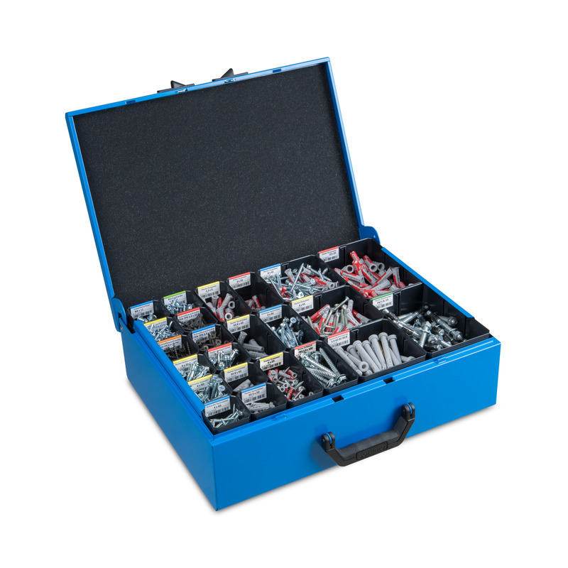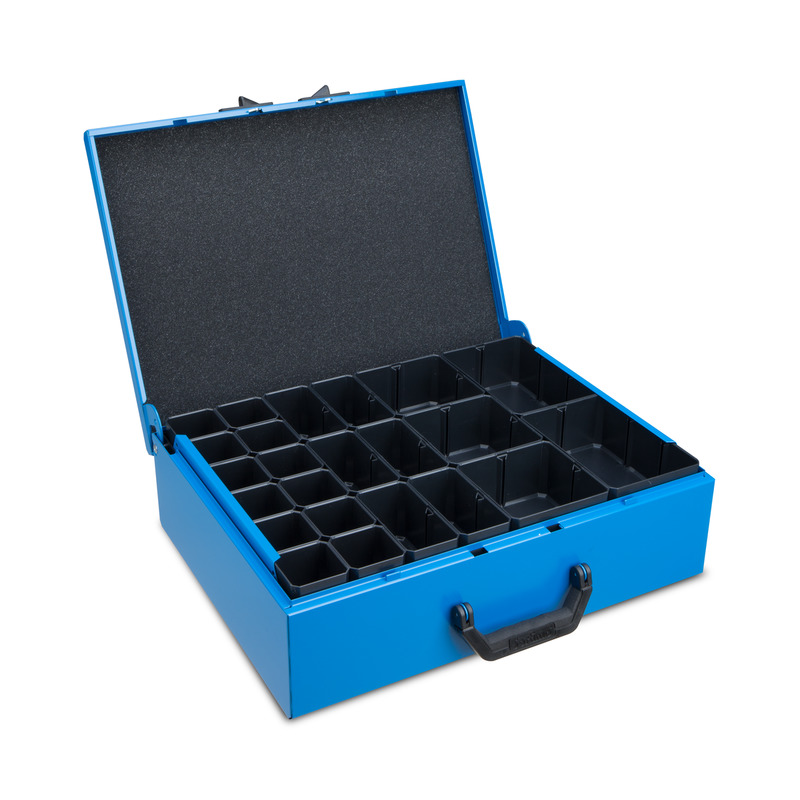 Der Metallkoffer überzeugt als zuverlässiges und praktisches Ordnungssystem. Hohe Zuladung und schwere Bestückung stellen in Sachen Funktionalität keine Einschränkung dar. Praktische Einhandbedienung mit 120 Grad Anschlagwinkel des Deckels und die flexible Ordnung im Inneren schaffen ein Höchstmaß an Arbeitserleichterung. Durch den ergonomisch geformten Tragegriff an der Vorderseite ist der Metallkoffer komfortabel im Handling und bietet Ihnen einen besonders angenehmen Tragekomfort. Die standardmäßig enthaltende Deckeleinlage aus Schaumstoff schließt die Insetboxen nach oben ab und verhindert somit ein Durchmischen der darin befindlichen Inhalte.